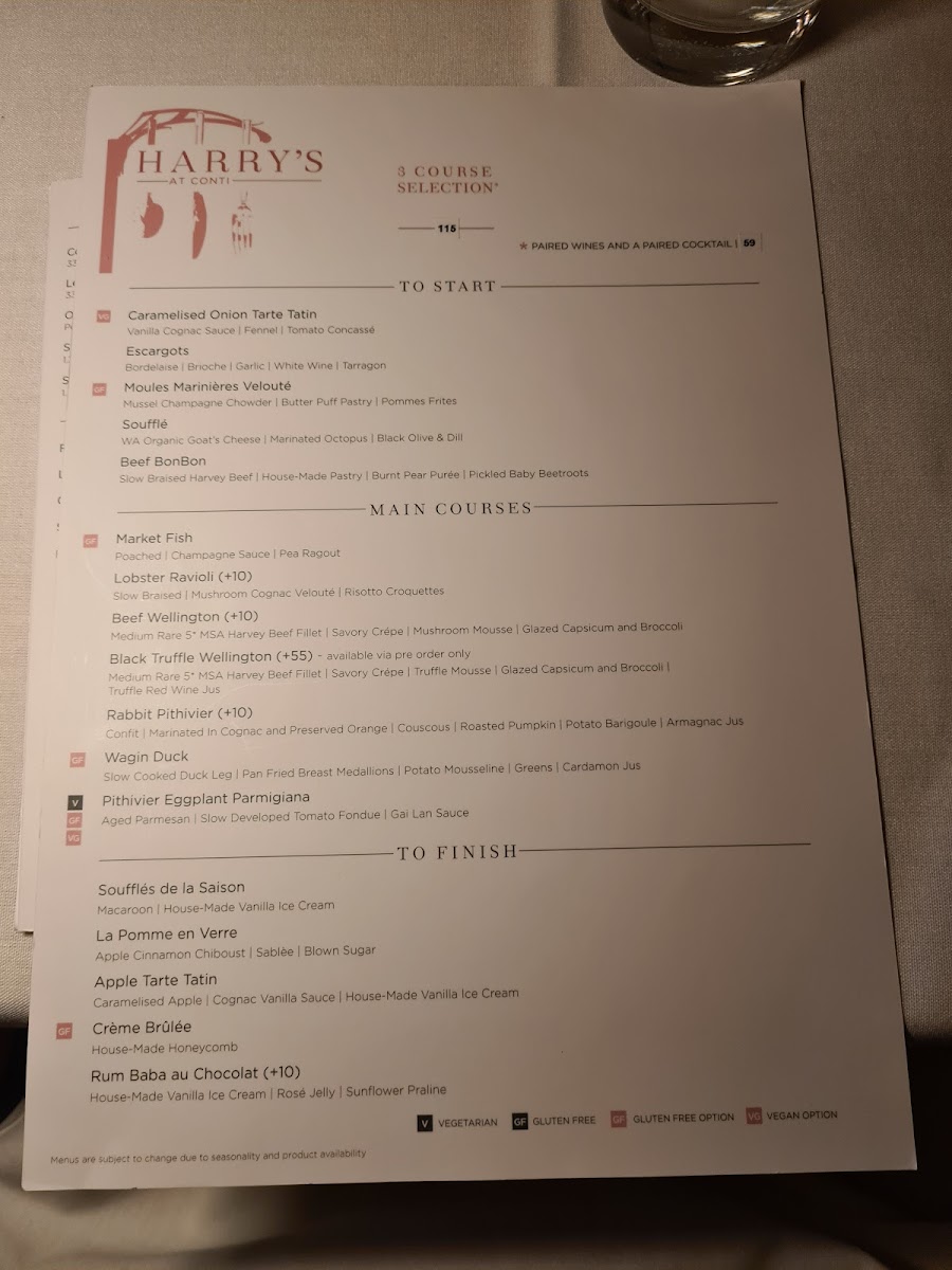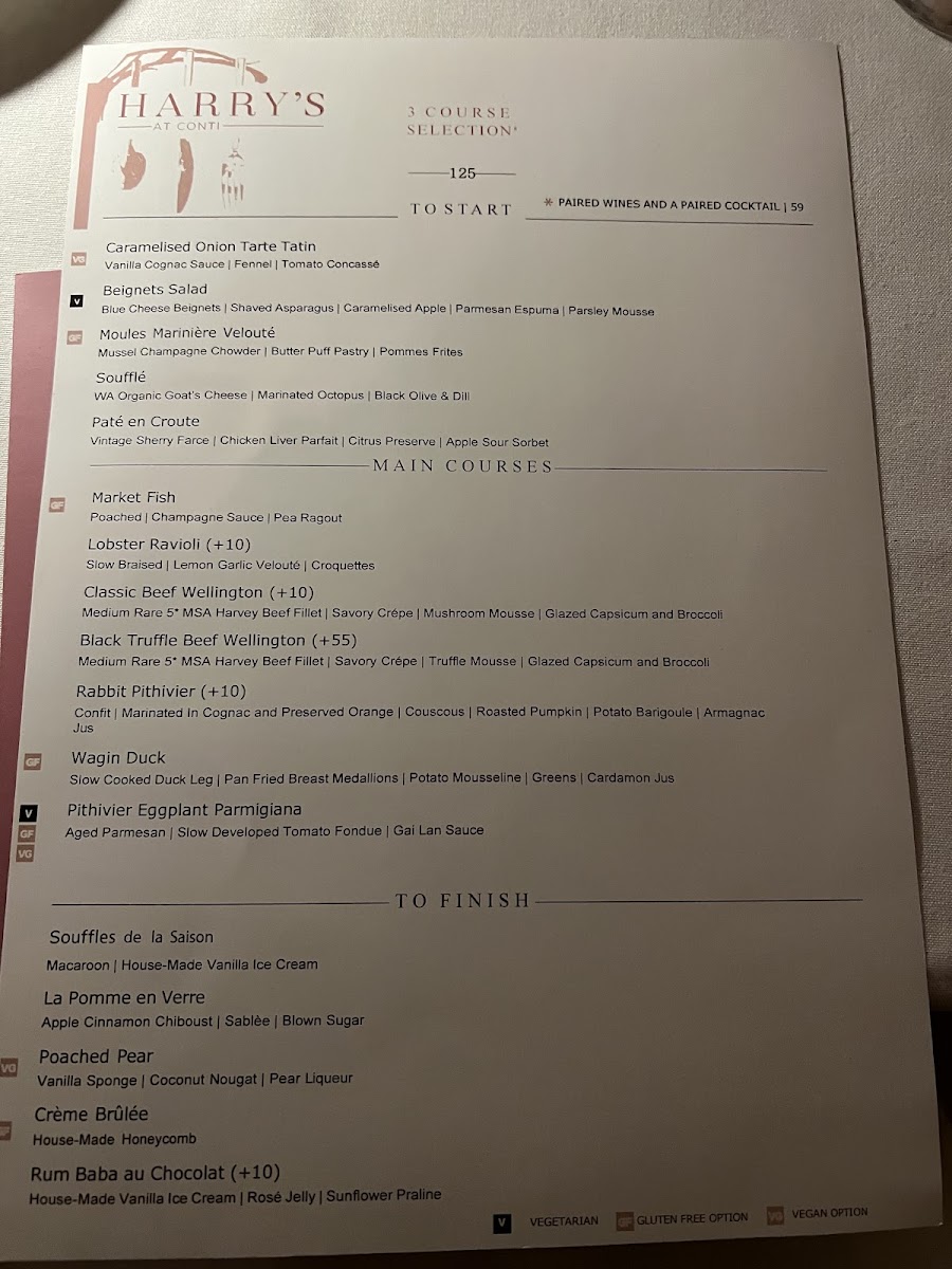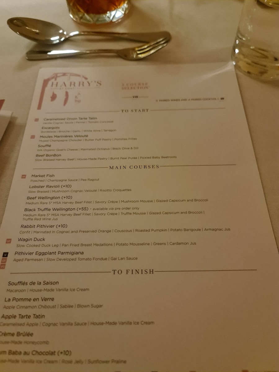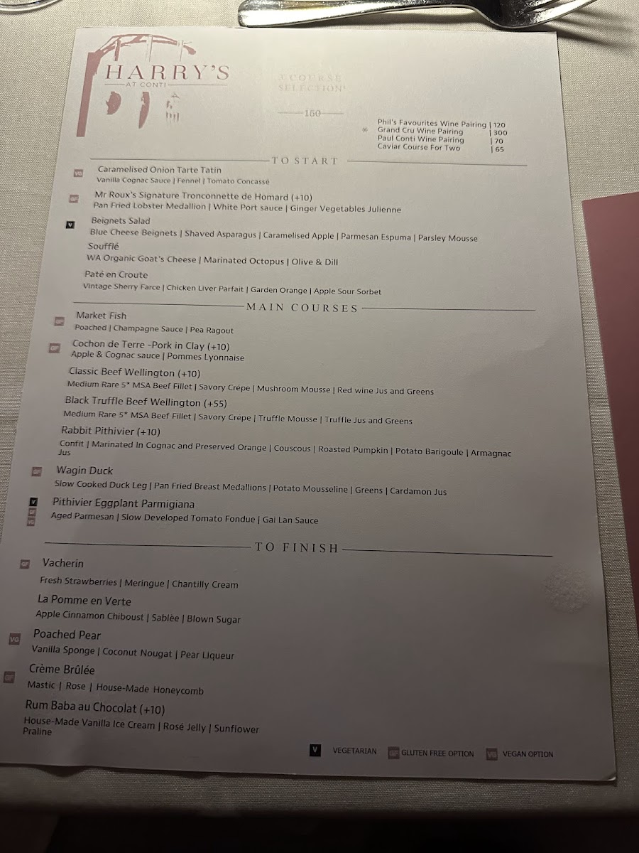 From a reviewer’s perspective, the menu at Harry's At Conti offers a refined and thoughtfully curated dining experience that brings classic European techniques into a contemporary Australian setting. The main courses form the heart of the menu, led by the iconic Classic Beef Wellington and the indulgent Black Truffle Beef Wellington, both showcasing precision and depth of flavour. Equally compelling are alternatives such as Rabbit Pithivier, Wagin Duck, Pithivier Eggplant Parmigiana, which provide balance between rich meat dishes and elegant vegetarian options.