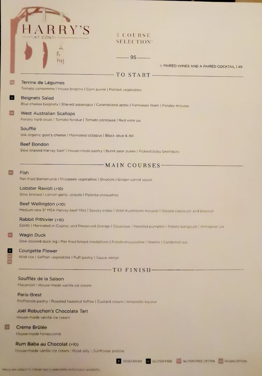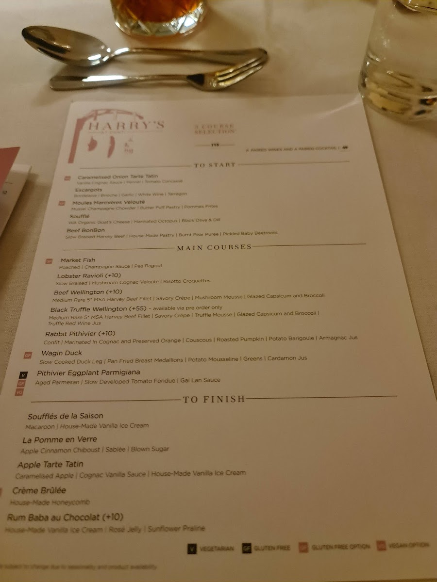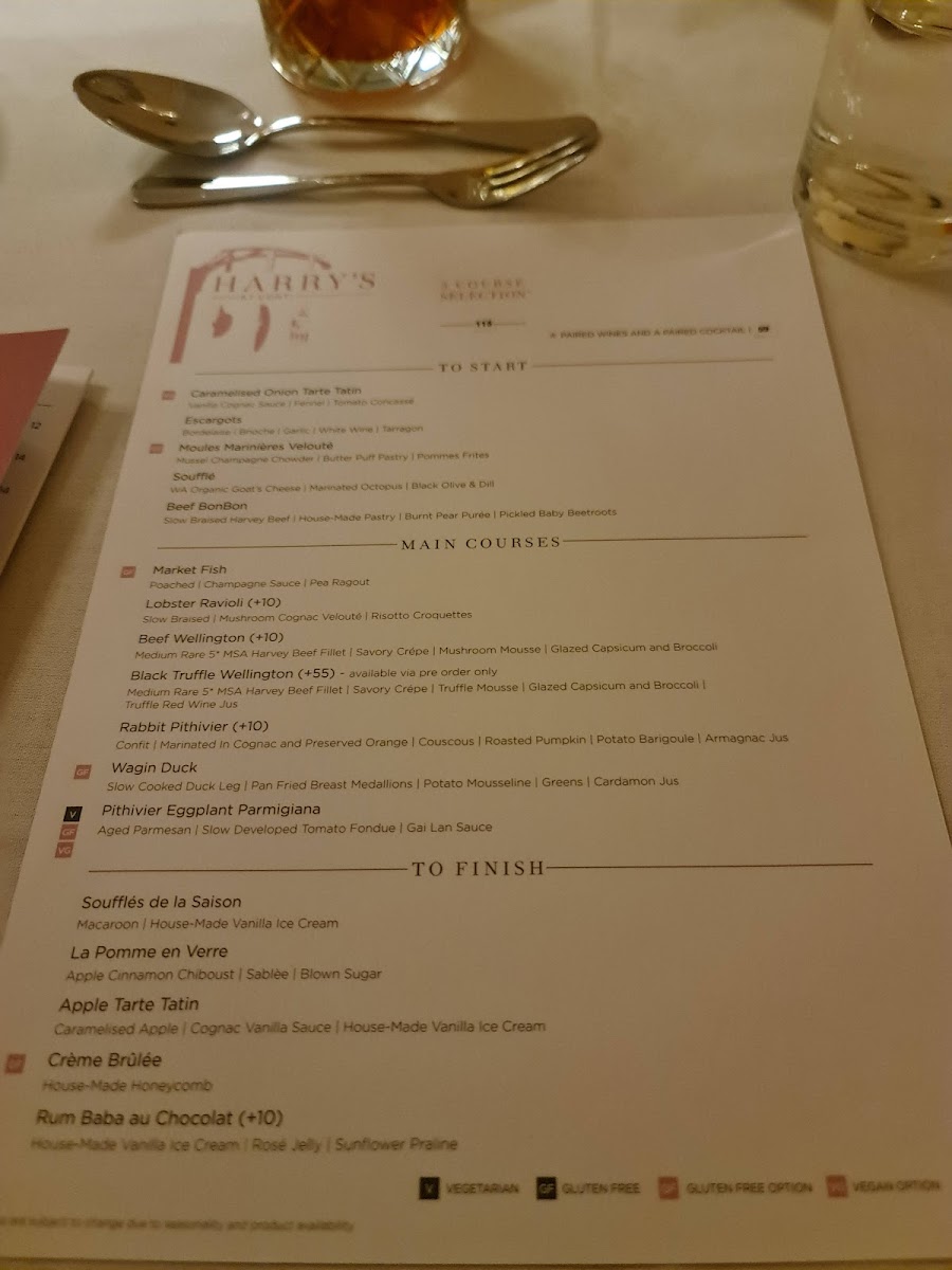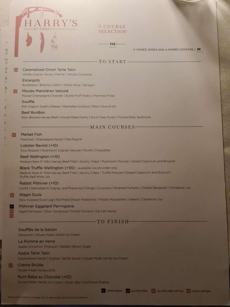 From a reviewer’s perspective, the menu at Harry's At Conti offers a refined and thoughtfully curated dining experience that brings classic European techniques into a contemporary Australian setting. The main courses form the heart of the menu, led by the iconic Classic Beef Wellington and the indulgent Black Truffle Beef Wellington, both showcasing precision and depth of flavour. Equally compelling are alternatives such as Rabbit Pithivier, Wagin Duck, Pithivier Eggplant Parmigiana, which provide balance between rich meat dishes and elegant vegetarian options.